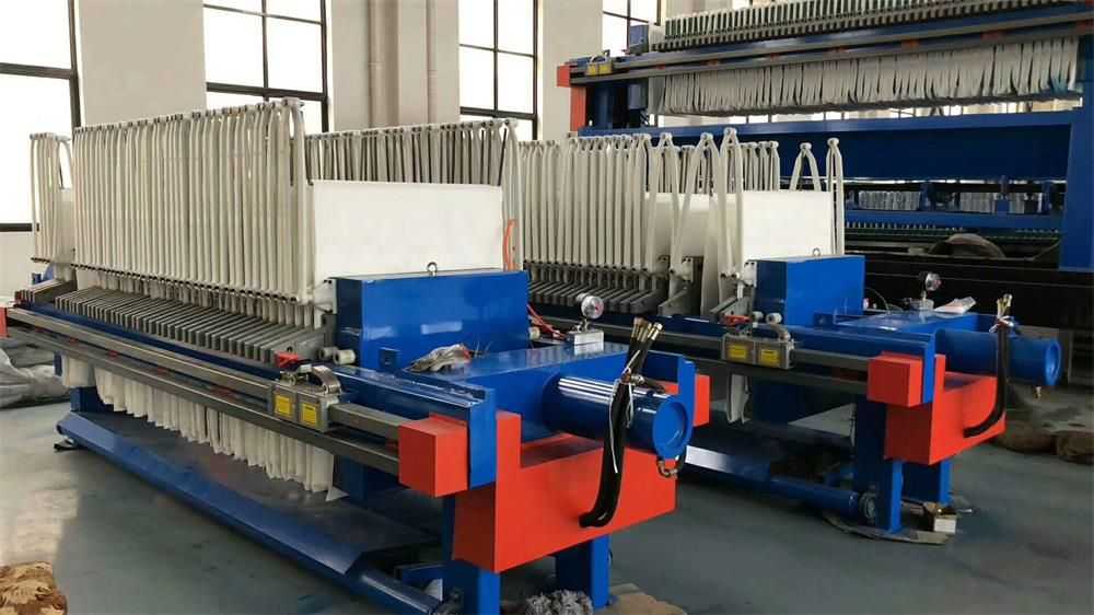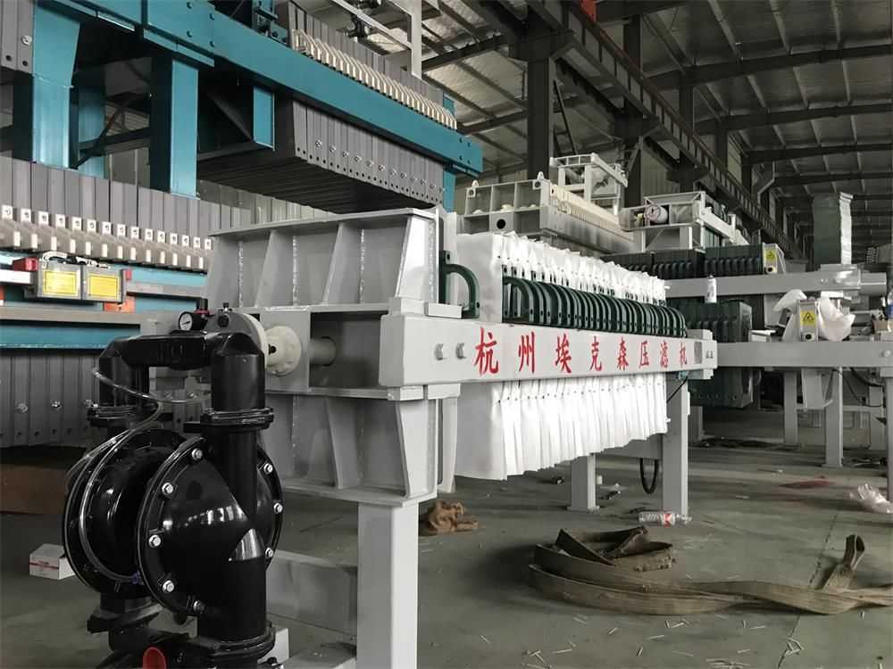 隔膜壓濾機和常規(guī)箱式壓濾機的主要區別在于,在濾板的兩側都增加了兩個彈性膜(復合橡膠膜是一個整體式膜。在操作期間,當進料完成時,將高壓流體介質注入膜中,并使整個膜膨脹以過濾濾餅,以進一步使濾餅脫水,這是壓力過濾。在隔膜壓濾機運行期間,液壓系統使用液壓油作為壓力載體來傳遞內部壓力。